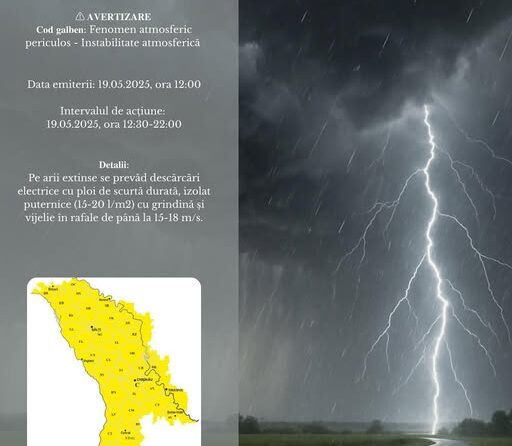 Serviciul Hidrometeorologic de Stat informează că la data de 19 mai 2025 în intervalul orelor 12.30 – 22.00, pe arii extinse se prevăd ploi de scurtă durată cu grindină și intensificări ale vântului în rafale de până la 15-18 m/s.