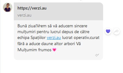 În același timp, pe adresa întreprinderii municipale continuă să vină mulțumiri pentru activitatea muncitorilor Secției Defrișare și Curățare Arbori care și-au îndeplinit rapid solicitările venite din partea cetățenilor.