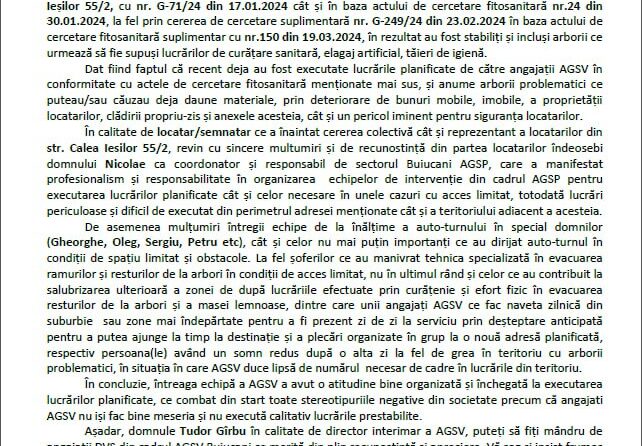 Astfel, locatarii din str. Calea Ieșilor 55/2 au adus mulțumiri efectivului de muncitori care au executat lucrări de defrișare la această adresă.”Aducem mulțumiri întregii echipe echipei de angajați ai I.M. AGSV pentru profesionalismul și responsabilitatea de care au dat dovadă la îndeplinirea lucrărilor planificate”, se arată în scrisoare.