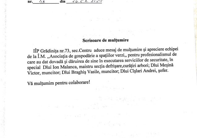 Astfel, în mesajul venit pe adresa întreprinderii municipale se evidențiază faptul că echipa condusă de dl. Ion Malanca, maistru secția Curățare și Defrișare arbori, “a dat dovadă de dăruire de sine în executarea lucrărilor executate” pe teritoriul instituției de învățământ preșcolar.