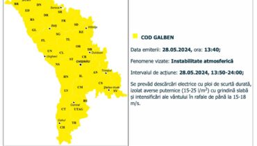 Î.M. AGSV ATRAGE ATENȚIA LOCUITORILOR ȘI CONDUCĂTORILOR AUTO Serviciul Hidrometeorologic de Stat informează că astăzi, 28 mai 2024, în intervalul orelor 14.00 – 24.00 pe arii extinse ale teritoriului Republicii…
